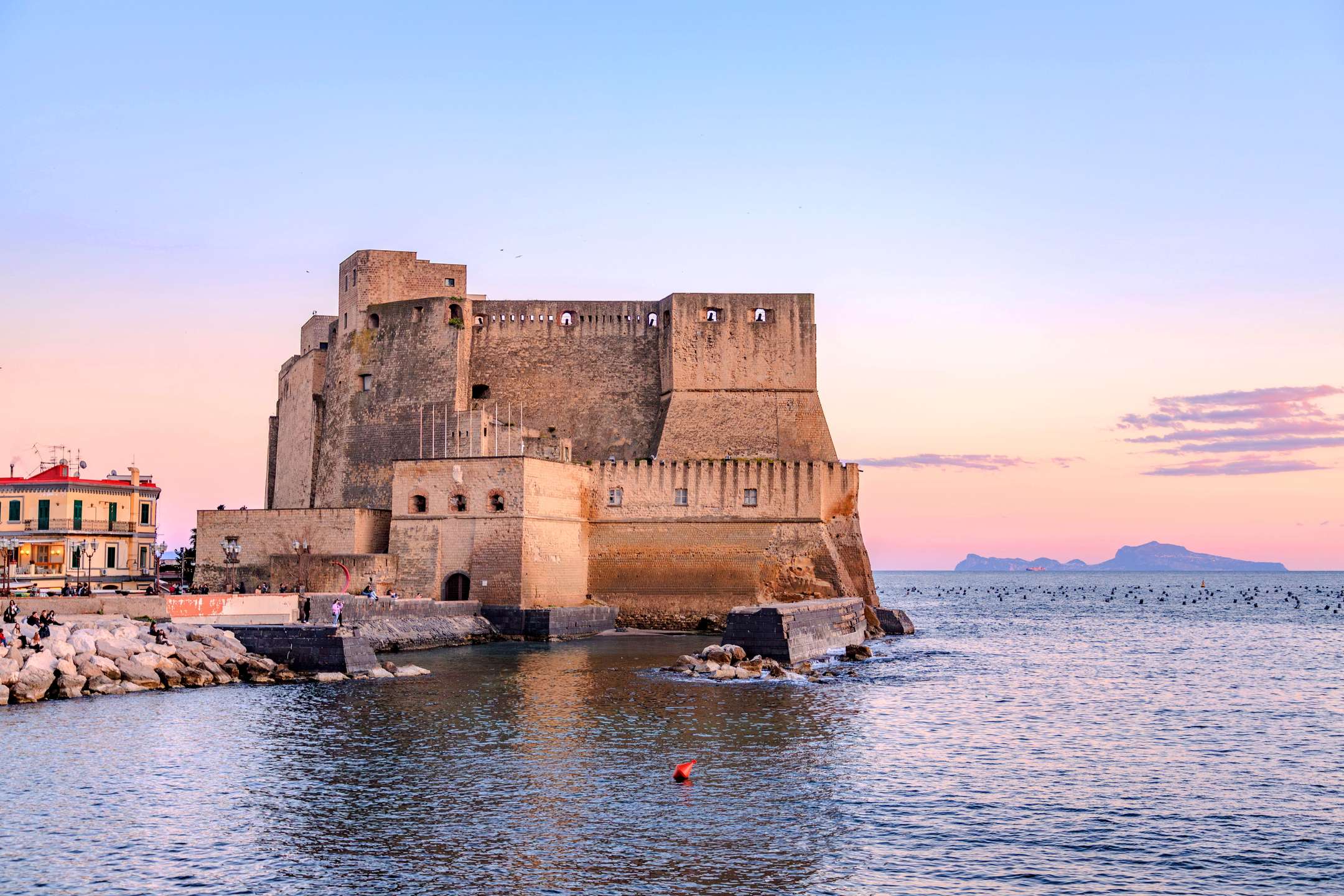 Ovo Castle is located on Megaride island and dates back to the 12th century. It is famous for a legend about an egg hidden beneath protecting the city. Castel dell'Ovo has been used to protect the city, as a prison, and as a royal residence. Today, Castel dell'Ovo hosts events and art exhibitions. Its location offers stunning views of the Gulf of Naples, with Mount Vesuvius in the backdrop. Visitors can always explore the castle's exteriors, while access to the interiors is reserved for special events. The exterior includes the Maglietto Pier, Normandy Tower, Church of San Salvatore, three terraces, and carved rock cells.